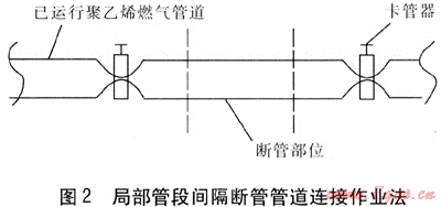 局部管段間隔斷管管道連接作業(yè)法見圖2。本作業(yè)適用于已運行聚乙烯燃?xì)夤艿琅c新建燃?xì)釶E管道的連接。在聚乙烯管道需連接部位左右適當(dāng)位置分別采用卡管器將已運行管道卡緊,選用隔爆手槍電鉆在需斷管部位打孔卸壓、斷管。將電熔套管安裝在斷管兩端口并與新建聚乙烯管進行電熔焊接,待焊接完成后松開卡管器,管道連接作業(yè)完成。此作業(yè)方法優(yōu)點主要是操作方便,但存在的問題主要有:
