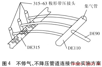 我們在津南開發(fā)區(qū)(東區(qū))建龍分子篩天然氣工程中進行該方法的實施作業(yè)。該工程新建DE90燃?xì)夤艿琅c已運行DE315燃?xì)夤艿肋B接,由于園區(qū)內(nèi)無法實施停氣降壓作業(yè),經(jīng)研究采用了鞍形帶壓接頭并聯(lián)方案。不停氣、不降壓管道連接作業(yè)實施方案見圖4。管道連接作業(yè)完成后,經(jīng)對用戶實際用氣設(shè)備燃?xì)饬髁?、壓力檢測,完全符合設(shè)計要求。此管道連接作業(yè)方法現(xiàn)已在我公司推廣使用,大大減少了氣量損失,加快了管道連接作業(yè)進度。但也存在不足之處,如DN 150mm以上管道若實施此方案,所需鞍形帶壓接頭數(shù)量過多,與集氣管連接受環(huán)境限制較大,因此在大管徑應(yīng)用上具有局限性。