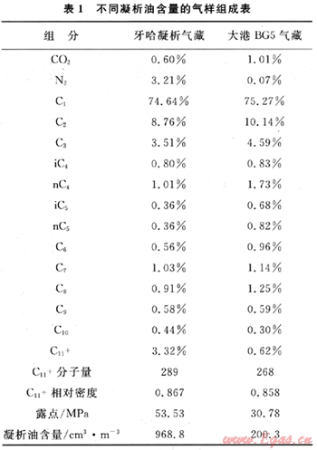 在本次研究中,分別采用了大港油田BG5氣藏和塔里木牙哈凝析氣藏的兩種代表性流體樣品。兩種凝析氣樣品的露點和凝析油含量差別比較大,具體組成和性質(zhì)參數(shù)見表1。