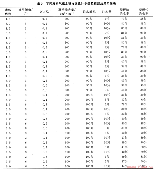 在前面凝析氣藏水驅(qū)方案確定之后,利用Eclipse數(shù)值模擬軟件的組分模擬器E300對其進(jìn)行了模擬運算,其結(jié)果見表3。