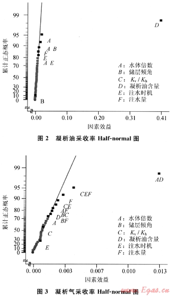 Half-normal圖的橫坐標(biāo)代表各因素在兩水平之間變化時引起的相應(yīng)凝析油氣指標(biāo)平均值的變化,縱坐標(biāo)代表累計概率。如果某因素從低到高變化時引起評價指標(biāo)的減少,那么其影響是負(fù)面的;反之如果引起評價指標(biāo)增大則說明其作用是正面的。該圖主要由代表不同因素和不同因素交互作用的點與一條通過大多數(shù)點的直線構(gòu)成。由代表不同因素的點偏離直線的程度可以看出其所對應(yīng)的指標(biāo)影響的重要性程度,由左到右偏離的越多影響越重要。