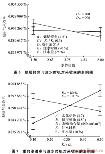 而由圖3可以看出各因素對于凝析氣的采收率影響的重要程度由高到低依次為:底水體積和凝析油含量的交互作用、垂向滲透率和注入時間及注水量的交互作用、注水體積、垂向滲透率和注入時機的交互作用等。