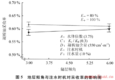 圖2為本次研究給定的氣藏條件和流體性質(zhì)情況下6個因素中對于凝析油的采收率指標(biāo)的Half-normal圖件,由它可以看出對于凝析油采收率不同因素影響的重要性程度由高到低依次為:凝析油含量、底水的體積、底水體積與地層傾角的交互作用、注水量、注入時機等。