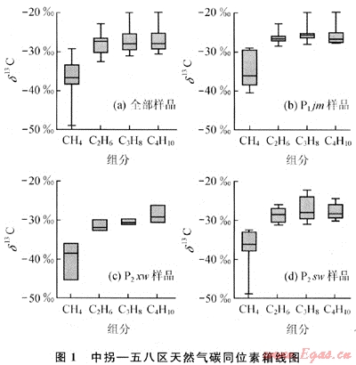 研究區(qū)天然氣甲烷碳同位素值多小于-30‰,主要為-38.51‰~-33.44%。,平均值為-36.83‰。乙烷、丙烷和丁烷的碳同位素值明顯偏重,其中,乙烷碳同位素值為-32.59‰~ -22.98‰;丙烷碳同位素值為-31.18‰~-20.12‰;丁烷的碳同位素值為-30.64‰~-20.02‰(圖1-a)。總體上看來,研究區(qū)內(nèi)天然氣樣品均具正碳同位素系列的特征(部分發(fā)生輕微倒轉(zhuǎn)),應(yīng)為有機成因氣[8~10],部分樣品發(fā)生輕微倒轉(zhuǎn)的原因可能主要在于有少量不同來源或不同成熟度的天然氣混入。各層組之間天然氣的穩(wěn)定碳同位素值存在差異,佳木河組和上烏爾禾組天然氣甲烷碳同位素值變化范圍相對較大,且碳同位素系列有倒轉(zhuǎn)現(xiàn)象,反映來源具有多樣性(圖1-b和圖1-d);下烏爾禾組天然氣甲烷碳同位素值分布范圍較小,且明顯偏輕,烷烴氣碳同位素值呈正碳同位素系列分布特征,反映來源單一(圖1-c)。