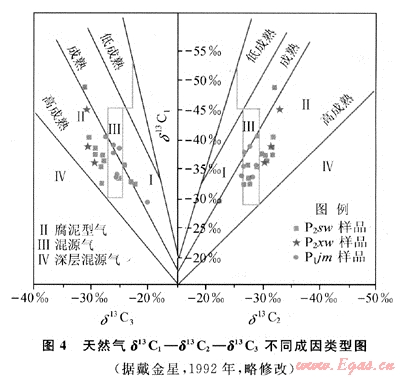 結(jié)合天然氣樣品在δ13C113C213C3關(guān)系圖版(圖4)上的分布特征,可綜合判定研究區(qū)佳木河組分布有干酪根初次裂解而成的煤型氣和混源氣2種天然氣,下烏爾禾組天然氣均為原油二次裂解而成的油型氣,而上烏爾禾組三者皆有分布。