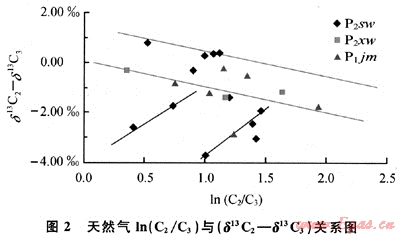 與干酪根初次裂解氣相比,原油二次裂解氣以C3的遞減速率高為特征。因此,利用(δ12C213C3)值與ln(C2/C3)值相關(guān)關(guān)系可有效區(qū)分干酪根初次裂解氣和原油二次裂解氣[11~12]。據(jù)此可判斷下烏爾禾組天然氣均為原油二次裂解成因氣,而佳木河組和上烏爾禾組天然氣成因類型相對多樣,既有干酪根初次裂解成因天然氣,也有原油二次裂解成因氣,同時也可能存在二者混合氣(圖2)。