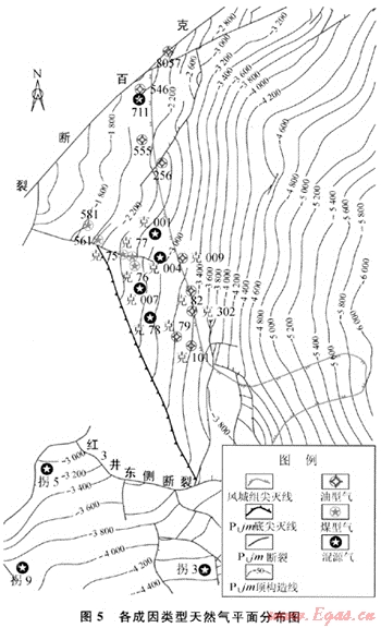 不同類型天然氣在平面上呈條帶狀分布(圖5)。油型氣主要沿風(fēng)城組尖滅線分布,該處緊鄰風(fēng)城組烴源巖,油型氣供給充足?;煸礆饩植加陲L(fēng)城組尖滅線以外的區(qū)域,該區(qū)域為佳木河組烴源巖的主要分布區(qū),同時也是風(fēng)城組烴源巖排烴的有利指向區(qū),易于煤型氣與油型氣發(fā)生混合。佳木河組內(nèi)部的煤型氣由于為自生自儲成因,分布相對廣泛;而上烏爾禾組煤型氣均集中分布在五區(qū)南斷裂附近,該斷裂為斷至佳木河組內(nèi)部的斷源斷裂,表明斷源斷裂是佳木河組烴源巖垂向排烴的優(yōu)勢通道。