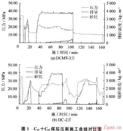 壓裂施工壓力高,曲線呈鋸齒狀,裂縫在延伸過程中可能遇到異常地質體或構造煤,延伸比較困難。表明煤層順走向、傾向的空間展布較復雜,需要進一步研究煤儲層的規(guī)律(見圖1)。尤其DC-2井C19+C23煤層實施了二次壓裂,工作壓力仍然居高不下,加砂的濃度上不去,造成后期排水時間增長,見氣時間晚。