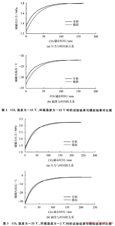 在相同初始充滿(mǎn)率下,測(cè)試不同環(huán)境溫度時(shí)儲(chǔ)存壓力及溫度的變化情況。試驗(yàn)采用不銹鋼小型儲(chǔ)罐,運(yùn)用自然升壓法測(cè)定儲(chǔ)罐內(nèi)介質(zhì)的蒸發(fā)量,利用恒溫槽改變介質(zhì)溫度及環(huán)境溫度,利用壓力傳感器得出儲(chǔ)槽內(nèi)壓力變化。試驗(yàn)裝置如圖1所示,C02溫度為-33℃,環(huán)境溫度為-22℃時(shí)的試驗(yàn)結(jié)果與模擬結(jié)果對(duì)比見(jiàn)圖2,CO2溫度為-33℃,環(huán)境溫度為-2℃時(shí)的試驗(yàn)結(jié)果與模擬結(jié)果對(duì)比見(jiàn)圖3。