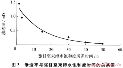 以氣驅(qū)水1h為例,驅(qū)替1h后,儲層滲透率越低,含水飽和度就越高,由此造成的暫時性水鎖損害越強(圖2),當滲透率從1.5mD降到0.04mD時,儲層滲透率損害率從17%增加到近90%。隨著驅(qū)替時間的增長,含水飽和度會逐漸降低,當驅(qū)替至束縛水飽和度時,暫時性水鎖完全解除。在驅(qū)替壓差及流體性質(zhì)一定的情況下,解除暫時性水鎖所需時間與儲層滲透率密切相關(guān),儲層滲透率越低,所用時間越長(圖3);當滲透率從1.5mD降到0.04mD時,驅(qū)替至束縛水飽和度時所用時間從1.5增加到50h,表明儲層滲透率越低,暫時性水鎖越難解除。地層條件下所能提供的最大壓降要比實驗室所用的壓差小得多,且實驗室用的是干氮氣,因此在地層條件下天然氣反排外來工作液至束縛水飽和度所需時間比實驗室長得多,其時間長短與儲層滲透率有關(guān)。