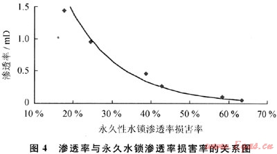 天然氣反排外來工作液降到束縛水飽和度后就再也不能降低了,由于儲層原始含水飽和度低于束縛水飽和度,這樣就有一部分水鎖永遠不能解除。永久性水鎖滲透率損害率與儲層滲透率密切相關(guān),儲層滲透率越低,束縛水飽和度與原始含水飽和度差值越大(表1、圖1),永久性水鎖滲透率損害率也越強(圖4)。當滲透率從1.5mD降到0.04mD時,永久性水鎖滲透率損害率從17.75%增至63.33%。