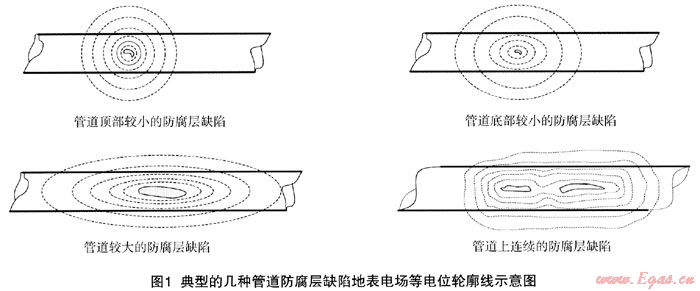 根據(jù)DCVG檢測(cè)的技術(shù)原理,通過(guò)對(duì)埋地管道防腐層缺陷處地表電場(chǎng)檢測(cè),繪出缺陷處地表電場(chǎng)等位線輪廓形狀,根據(jù)繪制的地表電場(chǎng)等電位線可以判斷埋地管道防腐層缺陷的形狀以及缺陷所在管體的位置。典型的電場(chǎng)等電位輪廓線有圖1所示的幾種[3]