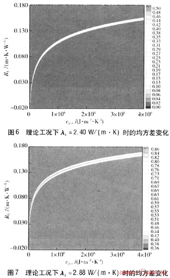 運(yùn)用參數(shù)估計(jì)法,給λs賦值:1.92、2.40、2.88W/(m·K),在參數(shù)估計(jì)中,分別對(duì)cp,s、Rb在一定的取值范圍內(nèi)連續(xù)賦值。通過計(jì)算機(jī)編程計(jì)算得到模擬工況下的均方差變化情況見圖12~14,圖右側(cè)色標(biāo)為均方差。由圖12~14可知,模擬工況下的結(jié)果不理想,均方誤差較小的淺色云圖中深色區(qū)域?qū)?yīng)多組cp,s、Rb,這樣就很難確定哪組數(shù)值是最優(yōu)值,即在參數(shù)估計(jì)中對(duì)其他參數(shù)的影響比較大。
