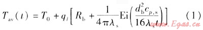 地埋管換熱器的傳熱模型主要有線熱源模型、柱熱源模型。線熱源模型是基于1948年Ingersoll和Plass等人發(fā)展的Kelvin線熱源理論[8]。工程上常見的地埋管換熱器的直徑一般為26~36mm,鉆孔深度為40~200m,與鉆孔深度相比,地埋管的直徑很小。在地埋管換熱器工作時(shí),相當(dāng)于在半無限大介質(zhì)中,鉆孔中心的一根線熱源與周圍巖土進(jìn)行熱交換。另外,假設(shè)沿地埋管長度方向傳熱量忽略不計(jì),周圍巖土均勻且線熱源與巖土的傳熱量恒定。由于該方法不受具體換熱器形式的限制,計(jì)算較簡單,且能滿足一般工程中土壤源熱泵系統(tǒng)設(shè)計(jì)計(jì)算的要求,具有較廣泛的實(shí)用性。根據(jù)假設(shè),可以得到地埋管內(nèi)流體平均溫度與鉆孔周圍巖土初始平均溫度及其他參數(shù)之間的關(guān)系式[9]