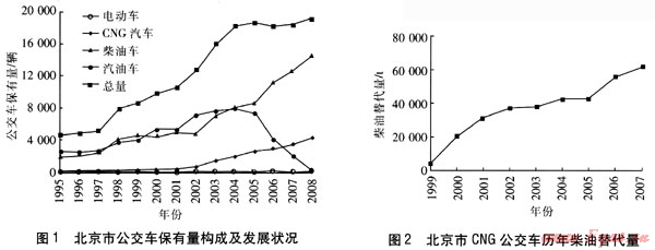 圖1為北京市公交車保有量構(gòu)成及發(fā)展?fàn)顩r,它顯示了1995—2008年北京市公交車總量以及其中汽油車、柴油車、CNG車和電動車這4種不同燃料類型汽車的發(fā)展趨勢??梢钥闯?,在1999—2008年這10年間,北京市天然氣公交車保有量的年均(3年滑動平均)增長率達(dá)到了21%,遠(yuǎn)高于同期北京市公交車總保有量7%的增長率,天然氣公交車同時也是各類公交車型中增長速度最快的車型。