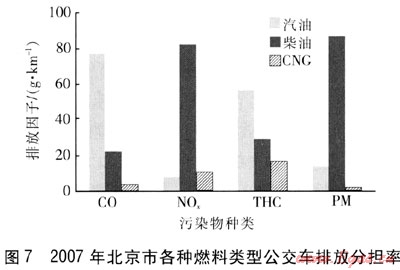 根據(jù)對2007年北京市現(xiàn)有公交車排放清單的分析,可以獲得各燃料類型公交車的排放分擔(dān)率,見圖7。雖然CNG公交車在北京市公交車車隊中占有20%的比例,但是不論是哪種污染物,其排放分擔(dān)率都顯著低于20%,尤其對于北京市大氣環(huán)境最為重要的控制污染物PM而言,其1%的低分擔(dān)率意義非同小可。對于公交車最引人關(guān)注的NOx和PM兩種污染物,柴油公交車都是最主要的排放源,其分擔(dān)率都超過了80%,使用CNG公交車替代柴油公交車可以有效地降低公交車NOx和PM總排放量。