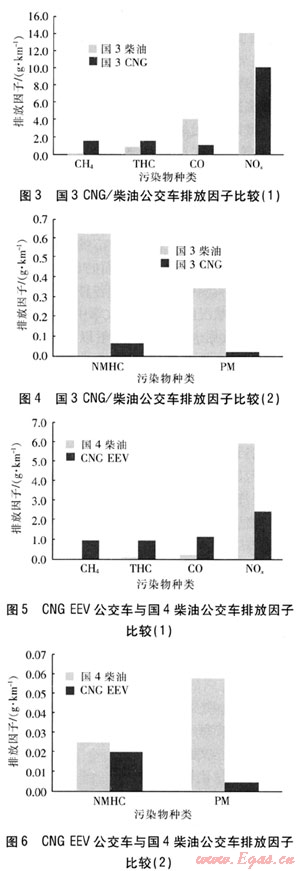 圖5、6為目前北京市排放控制水平最高的CNG EEV車型與國4柴油車排放的對比。可以看出: