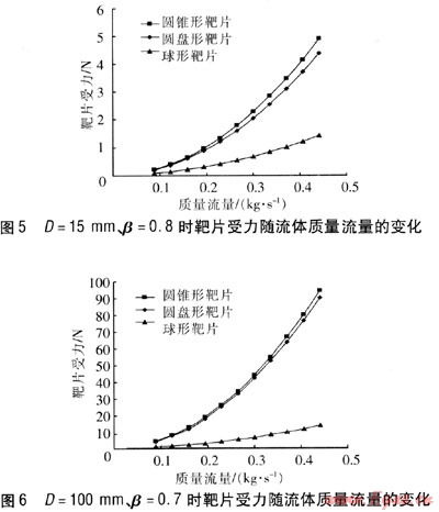 不同D、β下3種靶片受力隨流體質(zhì)量流量的變化見圖5、6。由圖5、6可知,在相同質(zhì)量流量下,靶片受力由尺到小依次是圓錐形、圓盤形、球形。不同質(zhì)量流量下流體流經(jīng)3種靶片的壓力損失見表1、2。由表1、2可知,隨著質(zhì)量流量的增加,流體流經(jīng)靶片的壓力損失也逐漸增加。相同質(zhì)量流量時,流經(jīng)圓盤形、圓錐形靶片的壓力損失接近,但大于球形。在D、β相同的情況下,圓錐形靶片與流體接觸的面積較大,而圓盤形靶片后部流體分離嚴重,因此二者對流體的擾動比較大,靶片受力較大,因渦流導致的壓力損失也相對較大。球形表面光滑,當流體通過時,狀態(tài)改變緩慢,對流體影響較小,因此其受力與流體壓力損失相對較小。因此,若要求靈敏度高(小流量)時,希望靶片受力大些,宜選用圓盤形靶片和圓錐形靶片。若要求靈敏度低(大流量)時,宜選用球形靶片。