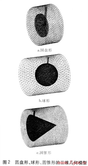 本文主要對圓盤形、球形、圓錐形靶片進行模擬分析。由FLUENT前處理軟件GAMBIT建立的這3種形狀靶片的三維幾何模型見圖2,流體的流動方向為自左向右。