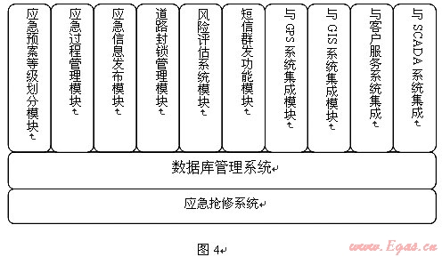 應(yīng)急搶修系統(tǒng)由應(yīng)急預(yù)案等級劃分模塊、應(yīng)急過程管理模塊、應(yīng)急信息發(fā)布模塊、道路封鎖管理模塊、風(fēng)險評估系統(tǒng)模塊、短信群發(fā)功能模塊、與GPS系統(tǒng)集成、與GIS系統(tǒng)集成、與CIS系統(tǒng)集成、與SCADA系統(tǒng)集成模塊等組成。功能模塊結(jié)構(gòu)見圖4