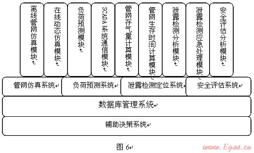輔助決策系統(tǒng)一辦包含管網(wǎng)仿真系統(tǒng)、負(fù)荷預(yù)測系統(tǒng)、泄露檢測定位系統(tǒng)、安全評估系統(tǒng)等系統(tǒng)組成,輔助決策系統(tǒng)結(jié)構(gòu)見圖6: