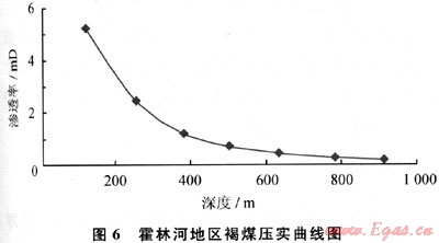 煤層氣勘探試驗(yàn)注入、壓降測試煤層埋深900m,煤層滲透率為0.91mD。對煤層進(jìn)行壓實(shí)曲線分析表明(圖6):煤層埋深100~500m,每增加100m,滲透率降低2.1mD;而在埋深500~900m,埋深每增加100m,滲透率降低0.1mD。說明埋藏早期以大孔隙壓實(shí)為主,后期以微孔隙壓實(shí)為主??傮w本區(qū)煤儲層物性好,滲透性較高,淺部煤層滲透率將更高。