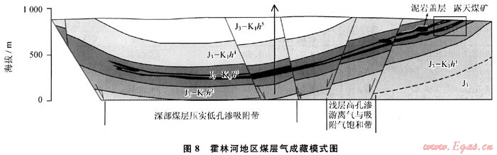 霍林河地區(qū)地下水環(huán)境較好,地下水為HCO3-Ca型和HCO3-Na-Ca型,礦化度低,淺層單斜緩坡容易形成生物氣補(bǔ)給;淺層孔滲性好,深部煤層氣向上運(yùn)移,淺部如蓋層條件好則在高部位富集成藏形成游離氣與吸附氣復(fù)式氣藏(圖8)。