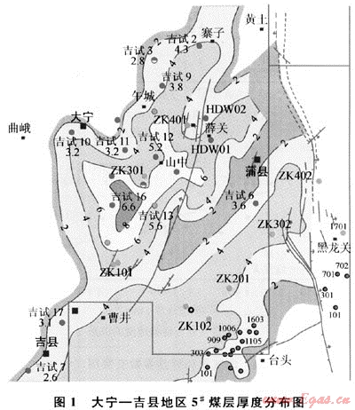 大寧-吉縣地區(qū)位于鄂爾多斯盆地東緣晉西撓褶帶中南段,呈西傾單斜構(gòu)造。主要含煤地層為下二疊統(tǒng)山西組,含煤層數(shù)有十幾層,其中山西組的5#煤層全區(qū)分布較穩(wěn)定,是煤層氣勘探開(kāi)發(fā)主要目的層[2~4],煤層埋深為700~1100m,厚度為1.5~7.2m,其中厚度超過(guò)5m的煤層主要位于午城-窯渠地區(qū),向東煤層厚度逐漸變薄(圖1)。