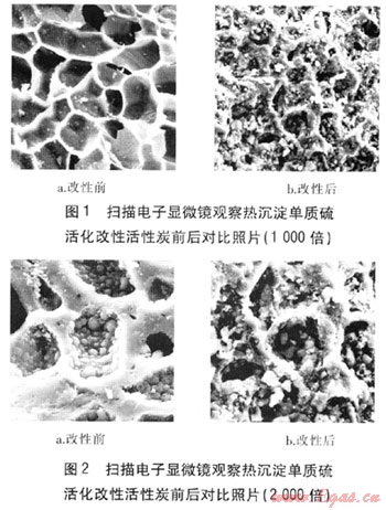對活性炭吸附能力起支配作用的是微孔的比例,經(jīng)過熱沉淀單質(zhì)硫活化改性后的活性炭比表面積增加,在表面以及內(nèi)部沉積硫顆粒,對汞的吸附能力大為增強(qiáng),而且硫與汞化學(xué)結(jié)合后能防止汞的再逸出。掃描電子顯微鏡觀察熱沉淀單質(zhì)硫活化改性活性炭前后對比照片(1000、2000倍)見圖1、2。由圖1可知,改性后的活性炭微孔比例顯著增加,由此活性炭的比表面積也增大,從而吸附能力也大幅增強(qiáng)。由圖2(與圖1為同一區(qū)域)可知,在改性后的活性炭微孔結(jié)構(gòu)中,大量沉積的硫與活性炭化合,形成親單質(zhì)汞的化合物,由此極大地提高活性炭對單質(zhì)汞的脫除能力。由Nucon公司生產(chǎn)的經(jīng)過熱沉淀單質(zhì)硫活化改性的活性炭的脫汞效率可提高70%以上。經(jīng)過碘化改性的活性炭,在同樣條件下,吸附脫汞能力是未經(jīng)改性活性炭的160倍[18],可以極大地減少活性炭用量。