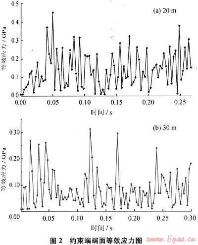 從20m和30m的射孔管柱約束端端面等效應(yīng)力數(shù)據(jù)圖看出(圖2),都存在正值的拉伸應(yīng)力,重力載荷對(duì)射孔管柱產(chǎn)生了預(yù)應(yīng)力作用,隨后應(yīng)力從正值開(kāi)始降低而來(lái)回震蕩,這個(gè)階段射孔沖擊載荷對(duì)射孔管柱起作用了。20m射孔管柱模型計(jì)算結(jié)果的等效應(yīng)力的最小值σmin=6.98MPa,最大值σmax=449.92MPa;而30m射孔管柱模型計(jì)算結(jié)果的等效應(yīng)力最小值σmin=6.81MPa,最大值σmax=311.98MPa。