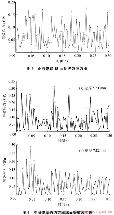 從圖3可知,30m射孔管柱距約束端15m處等效應(yīng)章的最小值σmin=3.01MPa,最大值σmax=173.89MPa。