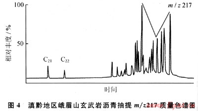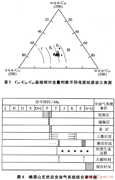 另據(jù)玄武巖瀝青的m/z217質(zhì)量色譜圖(圖4),規(guī)則甾烷呈近“V”字形,C27占優(yōu)勢,反映水生生物輸入有機質(zhì)較多,利用C27-C28-C29甾烷相對含量判斷烴源巖母質(zhì)類型(圖5),表明除水生生物外,還有部分腐殖型有機質(zhì)的輸入;由于上覆的沙灣組在漢王場-青神-犍為-珙縣以東地區(qū),已相變?yōu)楹谏搸r夾薄層石灰?guī)r,有時可見薄層碳質(zhì)頁巖和煤層[3],故推測氣源可能有上二疊統(tǒng)煤系地層的貢獻。