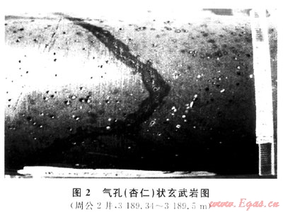多見于杏仁狀、氣孔(杏仁)狀玄武巖中(圖2),高溫玄武熔巖冷凝時氣體不斷向上排出,上部熔巖溫度下降快,成巖后使氣體封閉在巖體中形成氣孔;后因熱液作用和重結(jié)晶作用部分氣孔被次生礦物所充填,這種半充填的杏仁和未充填的氣孔是玄武巖原生孔隙的主體,但多是孤立的,需靠裂縫溝通。
