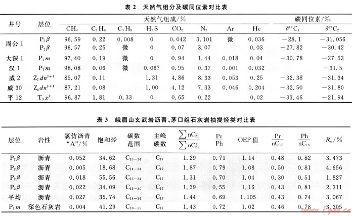 周公山玄武巖氣藏生產(chǎn)至今已愈17a,屬次生氣藏為學(xué)界共識,但氣源來自何層尚有歧義[3、5]。據(jù)表2可知,周公1井玄武巖與威遠震旦系氣組成差別大,后者N2、CO2、H2S、He含量高,CH4低,多數(shù)人認為氣源主要來自寒武系筇竹寺組,而川西南部地區(qū)受加里東運動影響,該套烴源巖剝蝕,殘余厚度僅0~70m。天然氣碳同位素揭示,玄武巖天然氣具油型氣特征,與川西南部上三疊統(tǒng)天然氣碳同位素有明顯差異。地面露頭地化分析(表3)表明,玄武巖瀝青苗的飽和烴色譜均以正構(gòu)烷烴為主,主峰都為nC17奇碳數(shù)優(yōu)勢,Pr/Ph為0.69、Pr/nC17為0.43、Ph/nC18為0.74、∑nC21-/∑nC21+為1.44、Ro為3.067%,與下伏的下二疊統(tǒng)石灰?guī)r具良好的親緣關(guān)系,推測烴源來自下二疊統(tǒng)。