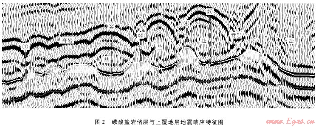 堤礁——外形近似為穹隆狀反射結構,頂、底部反射振幅較強。內部反射為層狀或平行狀,礁體規(guī)模較大,物性發(fā)育程度有所差異。