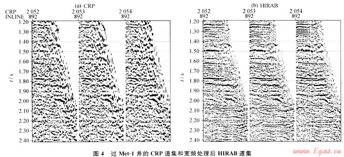 對保幅去噪的CRA道集進行寬頻處理,得到保幅寬頻高分辨率處理的HIRAB道集。圖4為過Met-1井(中間道集)的CRP道集和寬頻處理后的HIRAB道集??梢钥闯觯篐IRAB道集的分辨率大大提高,并且其信噪比亦明顯增強;兩種道集的波組關(guān)系與CRP道集一致。表明HIRAB具有很好的保幅性能。