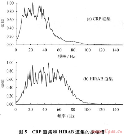圖5-a為CRP道集目的層段(1500~2200ms)的振幅譜,頻帶為6~48Hz,頻帶寬度為42Hz,主頻為27Hz(振幅譜中的強低頻能量是由遠炮檢距地震道的強低頻能量引起);圖5-b為HIRAB道集同層位的振幅譜,頻帶為12~76Hz,頻帶寬度為64Hz,主頻為44Hz。可以看出:經(jīng)過處理后的HIRAB道集的高頻拓展28Hz,頻帶展寬22Hz,主頻提高了17Hz。