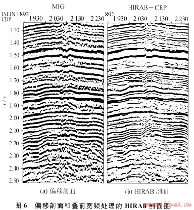 圖6為INLINE892的偏移剖面和疊前寬頻處理的HIRAB剖面圖??梢钥闯?,HIRAB剖面比偏移剖面的分辨率和信噪比都有明顯提高。