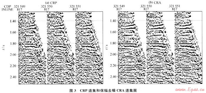 對包含中間道集的3個CRP道集進行保幅去噪,得到圖3中去噪后的CRA道集。從圖中可見,其信噪比明顯提高,波組關(guān)系沒有發(fā)生變化,道間的能量關(guān)系也未變。