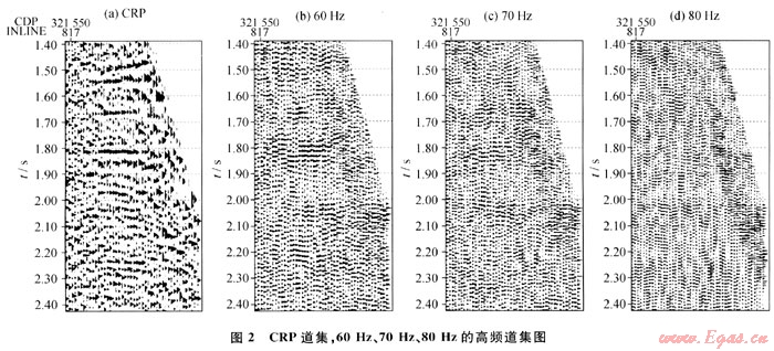 圖2為CRP道集及其60Hz、70Hz和80Hz的高頻道集。從圖中可以看出,60Hz和70Hz高頻道集的反射同相軸與CRP道集基本一致,而80Hz高頻道集的反射同相軸與CRP道集的一致性降低。對全區(qū)CRP道集的分析表明,本區(qū)70Hz以下的反射信號基本為有效信號[6]。