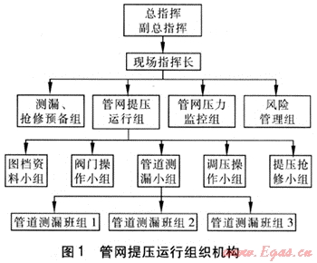管網(wǎng)提壓運(yùn)行指揮部由公司分管運(yùn)行副總經(jīng)理任總指揮,分管工程副總經(jīng)理任副總指揮。指揮部下設(shè)管網(wǎng)提壓運(yùn)行組、管網(wǎng)壓力監(jiān)控組、測(cè)漏、搶修預(yù)備組、風(fēng)險(xiǎn)管理組,另外公司相關(guān)職能部門如財(cái)務(wù)、采購、行政等管理部門按其職能給予配合。管網(wǎng)提壓運(yùn)行組,按工作職能具體劃分為閥門操作小組、調(diào)壓操作小組、提壓搶修小組、管道測(cè)漏小組、圖檔資料小組等5個(gè)小組。管道測(cè)漏小組根據(jù)區(qū)域管網(wǎng)提壓長(zhǎng)度及現(xiàn)有測(cè)漏人員和測(cè)漏儀器工具情況,可具體劃分為若干班組。管網(wǎng)提壓運(yùn)行組織機(jī)構(gòu)見圖1。