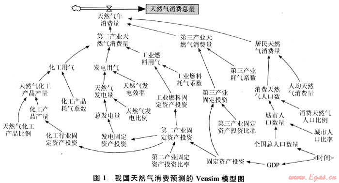天然氣消費(fèi)是一個(gè)復(fù)雜的非線性系統(tǒng),影響因素眾多。目前大多數(shù)以計(jì)量模型為基礎(chǔ)的預(yù)測(cè)方法只能考慮到兩到三方面的影響因素[1~6]。為了能夠更準(zhǔn)確地預(yù)測(cè)我國(guó)天然氣消費(fèi)量,本文采取系統(tǒng)動(dòng)力學(xué)的方法,利用能夠考慮多因素的Vensim系統(tǒng)動(dòng)力學(xué)軟件進(jìn)行建模預(yù)測(cè)。在構(gòu)建天然氣消費(fèi)預(yù)測(cè)模型時(shí),從國(guó)民經(jīng)濟(jì)的產(chǎn)業(yè)結(jié)構(gòu)入手,將天然氣消費(fèi)系統(tǒng)分為第一產(chǎn)業(yè)天然氣消費(fèi)量、第二產(chǎn)業(yè)天然氣消費(fèi)量、第三產(chǎn)業(yè)天然氣消費(fèi)量以及居民生活天然氣消費(fèi)量4個(gè)子系統(tǒng)。同時(shí),考慮到整個(gè)社會(huì)的經(jīng)濟(jì)發(fā)展水平以及人口數(shù)量對(duì)天然氣消費(fèi)量的直接影響,將GDP和全國(guó)人口數(shù)量作為預(yù)測(cè)我國(guó)天然氣消費(fèi)量的重要因素。我國(guó)天然氣消費(fèi)的系統(tǒng)動(dòng)力學(xué)預(yù)測(cè)模型如圖1所示。