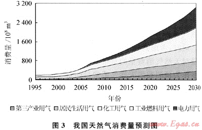 第二產(chǎn)業(yè)仍是天然氣消費(fèi)的主體,雖然在2010~2015年間由于居民生活用氣和第三產(chǎn)業(yè)用氣的迅速增長(zhǎng)使其比例有所降低,但一直占消費(fèi)總量的70%以上。預(yù)測(cè)顯示,天然氣化工用氣依然保持增長(zhǎng),2020年將達(dá)到488.9×108m3,2030年將達(dá)到689.4×108m3,年均增長(zhǎng)4.5%,但由于天然氣化工投資風(fēng)險(xiǎn)大、成本高、產(chǎn)業(yè)鏈短、效益低,未來(lái)不會(huì)大規(guī)模建設(shè),因而增長(zhǎng)速度逐步放緩。這使化工用氣比例逐漸下降,2020年降為26.7%,2030年降為22.8%。發(fā)電用氣增長(zhǎng)速度最快,年均增長(zhǎng)11.5%;2020年達(dá)到381.3×108m3,占天然氣消費(fèi)總量的20.8%;2030年達(dá)到864.4×108m3,比例上升為28.6%。天然氣發(fā)電具有效率高、建設(shè)周期短、設(shè)備運(yùn)行靈活、環(huán)境污染低等諸多優(yōu)點(diǎn),但是根據(jù)我國(guó)2007年頒布的《天然氣利用政策》,目前我國(guó)天然氣發(fā)電將主要用于調(diào)峰電站。工業(yè)燃料用氣在2020年將達(dá)到432.0×108m3,2030年將達(dá)到707.3×108m3,年均增長(zhǎng)5.9%;雖然絕對(duì)數(shù)量不小,但其在天然氣消費(fèi)總量中的比例一直在緩慢降低,2020年為23.6%,2030年為23.4%,這與未來(lái)我國(guó)工業(yè)化程度逐步加深,經(jīng)濟(jì)發(fā)展趨緩是密不可分的。