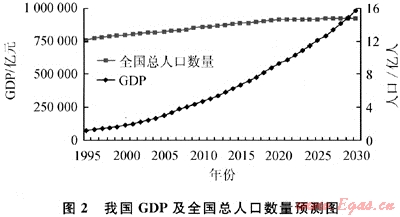 在所建立的系統(tǒng)動(dòng)力學(xué)模型中,GDP與總?cè)丝跀?shù)量是預(yù)測(cè)我國(guó)天然氣消費(fèi)的重要因素。在進(jìn)行各個(gè)子系統(tǒng)天然氣消費(fèi)預(yù)測(cè)時(shí),必須首先掌握這兩個(gè)因素的變化規(guī)律。根據(jù)國(guó)務(wù)院發(fā)展研究中心對(duì)我國(guó)經(jīng)濟(jì)增長(zhǎng)前景的預(yù)測(cè)以及國(guó)家人口和計(jì)劃生育委員《國(guó)家人口發(fā)展戰(zhàn)略研究報(bào)告》的基本判斷,我國(guó)GDP的總量和未來(lái)全國(guó)總?cè)丝跀?shù)量預(yù)測(cè)結(jié)果如圖2所示。為了便于計(jì)算和對(duì)比,GDP以2005年不變價(jià)格計(jì)算。