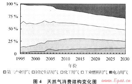 目前我國(guó)天然氣消費(fèi)主體為化工用氣與工業(yè)燃料用氣,發(fā)電用氣、第三產(chǎn)業(yè)用氣以及居民生活用氣的比例相對(duì)較小。隨著天然氣消費(fèi)總量的增長(zhǎng),消費(fèi)結(jié)構(gòu)也將發(fā)生很大的變化,如圖4所示。