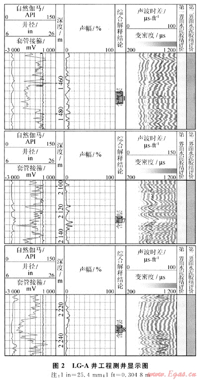 表1是LG-A井固井質(zhì)量的統(tǒng)計表。統(tǒng)計井段為0~2363.0m。