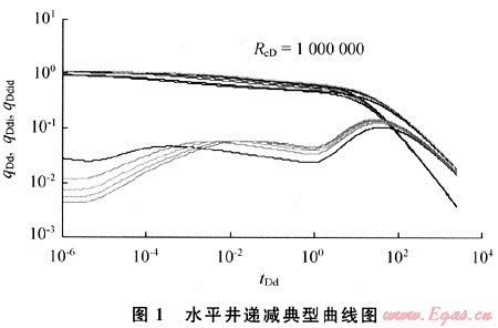 2) 通過計(jì)算,給出了水平氣井的產(chǎn)量遞減典型曲線圖版,可以看出,產(chǎn)量導(dǎo)數(shù)曲線分為3個(gè)階段,早期為垂直徑向流階段;中期為平面徑向流階段,有一明顯的“臺階”特征;晚期為擬穩(wěn)態(tài)流階段,產(chǎn)量急劇下降。