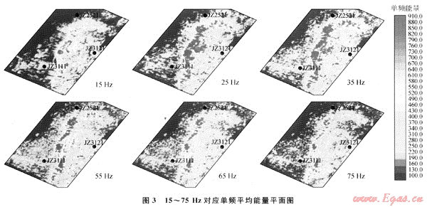 利用基于廣義S變換的頻譜成像儲層預(yù)測技術(shù)對JZ31-6構(gòu)造東二下段北部濁積體開展了研究。利用頻率掃描結(jié)果分析東二下段北部濁積體整體和局部單頻能量強弱的變化,進而了解砂體整體和局部特征如厚度、砂體尖滅邊界等。圖3為東二下段北部濁積體從15Hz到75Hz對應(yīng)單頻平均能量的平面圖,顏色越紅表示能量越強。從15Hz到35Hz的分頻平面圖反映出了該濁積體厚層和整體特征;從35Hz到75Hz的分頻平面圖,逐步反映出了砂體薄層和局部特征。35Hz的分頻平面圖比較模糊的地反映出了濁積體由3個局部砂體組成。在更高頻率的分頻平面圖上,更清楚地反映出北部濁積體是由3個局部砂體組成的。這一預(yù)測結(jié)果已被后來鉆井所證實。