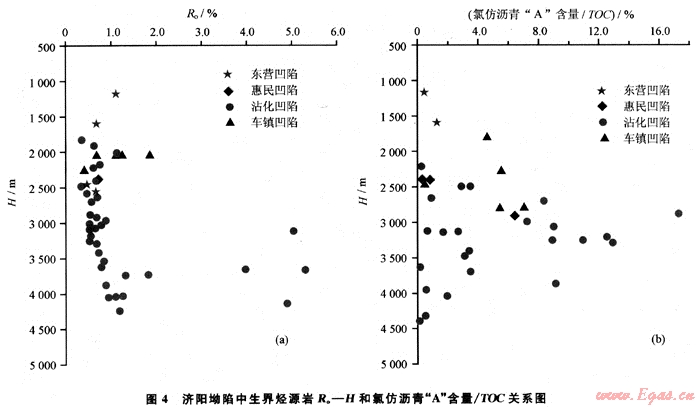 濟(jì)陽(yáng)坳陷中生界烴源巖有機(jī)質(zhì)的演化程度,無(wú)論是平面上還是縱向上都具有很強(qiáng)的不均衡性。從平面上看(圖4),不同地區(qū)有機(jī)質(zhì)熱演化程度差異明顯,沾化凹陷有機(jī)質(zhì)成熟度范圍分布較寬,Ro主要分布在0.45%~1.88%,部分樣品Ro在6.25%~6.55%,已經(jīng)進(jìn)入過(guò)成熟階段;車鎮(zhèn)凹陷大王莊地區(qū)成熟度低,Ro在0.62%~0.67%,剛進(jìn)入成熟階段,個(gè)別樣品超過(guò)1.0%;東營(yíng)、惠民凹陷則正處于大量生烴階段。從縱向上看,盡管總的趨勢(shì)是Ro在深部位要高于淺部位,但是有機(jī)的熱演化程度并非取決于現(xiàn)今的埋深,同一個(gè)Ro值,對(duì)于不同的鉆孔有著不同的埋深;截取同一埋深,對(duì)應(yīng)不同的鉆孔也有不同的反射率,并且可溶有機(jī)質(zhì)的轉(zhuǎn)化率氯仿瀝青“A”含量/TOC也是在同一深度具有不同的數(shù)值,而相同的氯仿瀝青“A”含量/TOC在不同深度均有分布(圖4)。