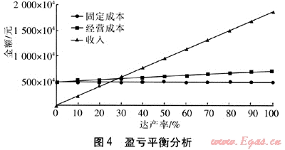 盈虧平衡分析主要是測(cè)算項(xiàng)目投產(chǎn)后盈虧平衡點(diǎn)(BEP),以考察項(xiàng)目對(duì)風(fēng)險(xiǎn)的承受能力。圖4為該項(xiàng)目的盈虧平衡分析,分析了固定成本、經(jīng)營成本、收入和達(dá)產(chǎn)率的關(guān)系。從圖4可以看出,在達(dá)產(chǎn)率為28%時(shí),收支相抵,當(dāng)達(dá)產(chǎn)率超過28%時(shí),就可以實(shí)現(xiàn)贏利。